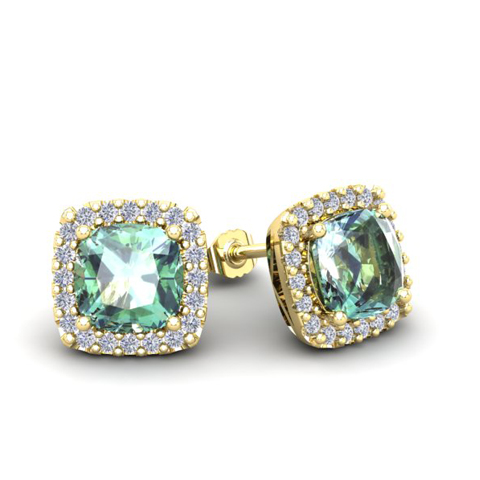 These stunning gemstone and halo diamond earrings feature two 8x8mm cushion cut green amethyst gemstones at 4.20 carats. The gemstones are surrounded by 40 sparkling diamonds in a halo in I-J color, SI2-I1 clarity at 0.50 carats. Total gem weight is 4.70 carats. These earrings are crafted in 14 karat yellow gold and come with comfortable and secure post with friction backs.