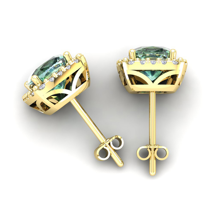 These stunning gemstone and halo diamond earrings feature two 8x8mm cushion cut green amethyst gemstones at 4.20 carats. The gemstones are surrounded by 40 sparkling diamonds in a halo in I-J color, SI2-I1 clarity at 0.50 carats. Total gem weight is 4.70 carats. These earrings are crafted in 14 karat yellow gold and come with comfortable and secure post with friction backs.