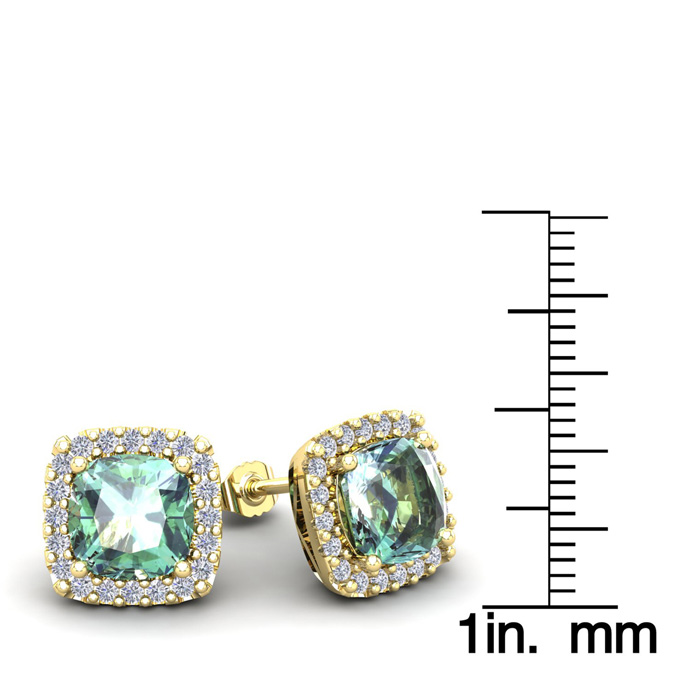 4 3/4 Carat Cushion Cut Green Amethyst and Halo Diamond Stud Earrings In 14 Karat Yellow Gold