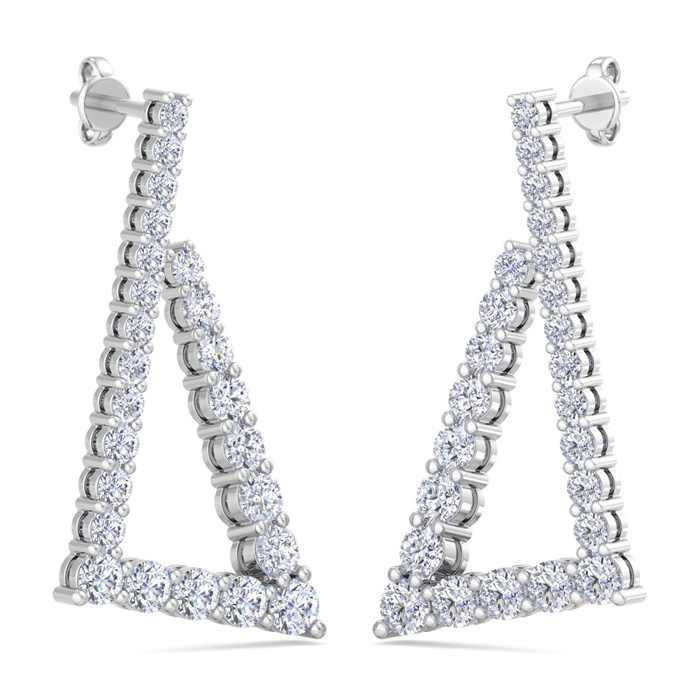 These lab grown diamond earrings feature 48 sparkling round shape lab grown diamonds totaling 4 3/4 carats. Diamond color is G-H, diamond clarity VS. These earrings are in 14 karat white gold and have comfortable and secure post with friction backs. The earrings drop down 1 1/2 Inches!