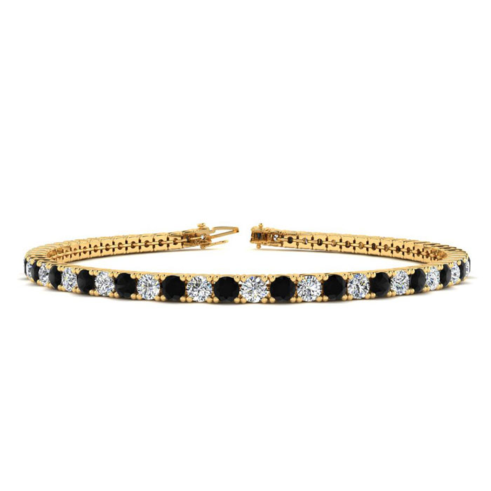 This classic mens diamond bracelet features shimmering white diamonds in J-K color, I1-I2 clarity and black diamonds in I3 clarity. The 6 inch bracelet contains 58 black and white diamonds at 3.48 carats. The 6.5 inch bracelet contains 55 black and white diamonds at 3.60 carats. The 7 inch bracelet contains 59 black and white diamonds at 3.90 carats. The 7.5 inch bracelet contains 63 black and white diamonds at 4.20 carats. The 8 inch bracelet contains 67 black and white diamonds at 4.44 carats. The 8.5 inch bracelet contains 72 black and white diamonds at 4.74 carats. The 9 inch bracelet contains 76 black and white diamonds at 5.04 carats. This bracelet is approximately 2.5mm wide and is crafted in 14 karat yellow gold. This bracelet has a secure, box with tongue and safety clasp.