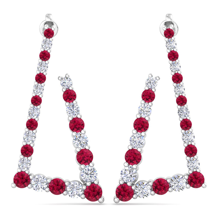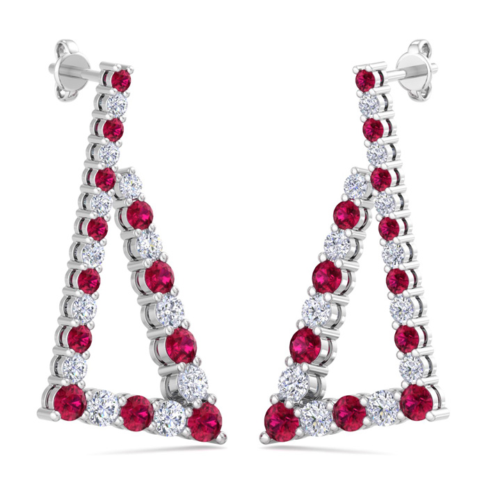 These lab grown diamond earrings feature 24 sparkling round shape lab grown diamonds and 24 ruby gemstones totaling 4 3/4 carats. Diamond color is G-H, diamond clarity VS. These earrings are in 14 karat white gold and have comfortable and secure post with friction backs. The earrings drop down 1 1/2 Inches!