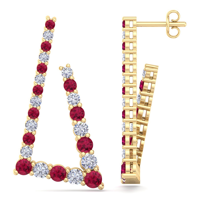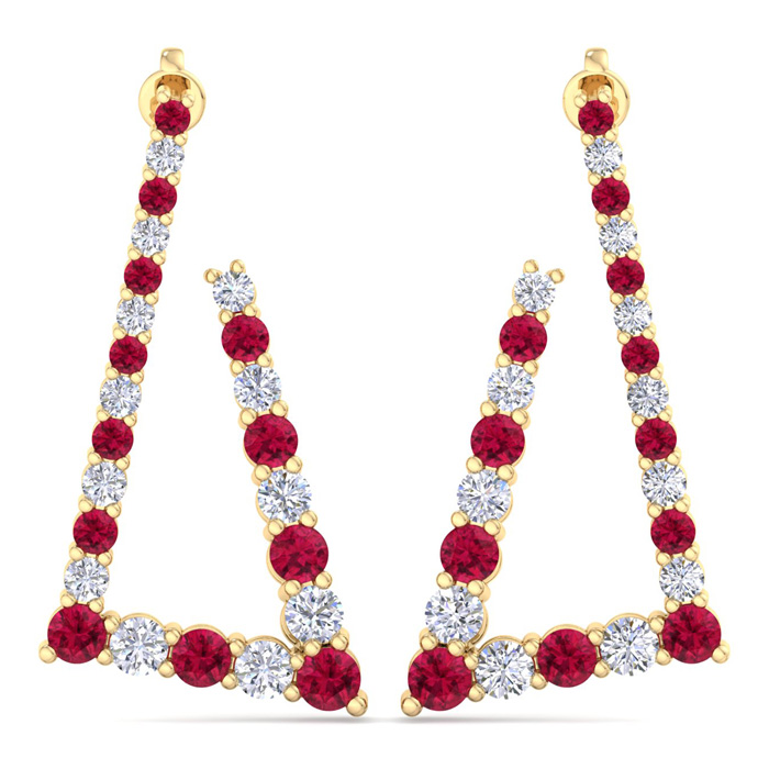 These lab grown diamond earrings feature 24 sparkling round shape lab grown diamonds and 24 ruby gemstones totaling 4 3/4 carats. Diamond color is G-H, diamond clarity VS. These earrings are in 14 karat yellow gold and have comfortable and secure post with friction backs. The earrings drop down 1 1/2 Inches!