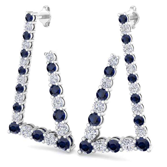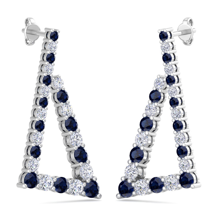 These lab grown diamond earrings feature 24 sparkling round shape lab grown diamonds and 24 sapphire gemstones totaling 4 3/4 carats. Diamond color is G-H, diamond clarity VS. These earrings are in 14 karat white gold and have comfortable and secure post with friction backs. The earrings drop down 1 1/2 Inches!