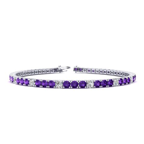 This classic gemstone bracelet features shimmering white diamonds in J-K color, I1-I2 clarity and amethyst gemstones. The 6 inch bracelet contains 57 gemstones and diamonds at 2.71 carats. The 6.5 inch bracelet contains 62 gemstones and diamonds at 2.95 carats. The 7 inch bracelet contains 67 gemstones and diamonds at 3.19 carats. The 7.5 inch bracelet contains 72 gemstones and diamonds at 3.42 carats. The 8 inch bracelet contains 76 gemstones and diamonds at 3.61 carats. The 8.5 inch bracelet contains 81 gemstones and diamonds at 3.85 carats. The 9 inch bracelet contains 86 gemstones and diamonds at 4.09 carats. This bracelet is approximately 2.25mm wide and is crafted in 14 karat white gold. This bracelet has a secure, box with tongue and safety clasp.