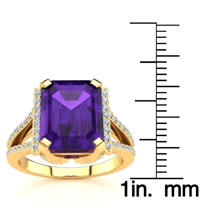 This stunning gemstone and diamond ring features one 10x8mm emerald cut amethyst gemstone at 3 3/4 carats. It is surrounded by 72 sparkling diamonds in a halo and down the band in I-J color, I1-I2 clarity at 1/2 carat. Total gem weight is 4 carats. This ring is crafted in 14 karat yellow gold.