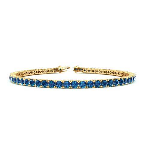 This classic gemstone bracelet features shimmering blue diamonds in I3 clarity. The 6 inch bracelet contains 58 blue diamonds at 3.48 carats. The 6.5 inch bracelet contains 55 blue diamonds at 3.60 carats. The 7 inch bracelet contains 59 blue diamonds at 3.90 carats. The 7.5 inch bracelet contains 63 blue diamonds at 4.20 carats. The 8 inch bracelet contains 67 blue diamonds at 4.44 carats. The 8.5 inch bracelet contains 72 blue diamonds at 4.74 carats. The 9 inch bracelet contains 76 blue diamonds at 5.04 carats. This bracelet is approximately 2.5mm wide and is crafted in 14 karat yellow gold. This bracelet has a secure, box with tongue and safety clasp.