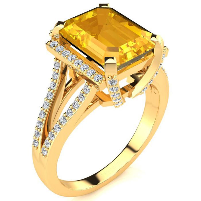 This stunning gemstone and diamond ring features one 10x8mm emerald cut citrine gemstone at 3 3/4 carats. It is surrounded by 72 sparkling diamonds in a halo and down the band in I-J color, I1-I2 clarity at 1/2 carat. Total gem weight is 4 carats. This ring is crafted in 14 karat yellow gold.