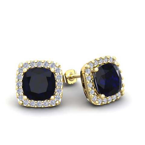 These stunning gemstone and halo diamond earrings feature two 7x7mm cushion cut created sapphire gemstones at 3.54 carats. The gemstones are surrounded by 40 sparkling diamonds in a halo in I-J color, SI2-I1 clarity at 0.40 carats. Total gem weight is 3.94 carats. These earrings are crafted in 14 karat yellow gold and come with comfortable and secure post with friction backs.