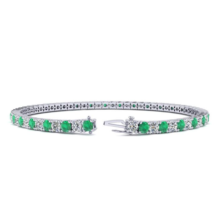 This classic gemstone bracelet features shimmering white diamonds in J-K color, I1-I2 clarity and emerald gemstones. The 6 inch bracelet contains 57 gemstones and diamonds at 2.84 carats. The 6.5 inch bracelet contains 62 gemstones and diamonds at 3.10 carats. The 7 inch bracelet contains 67 gemstones and diamonds at 3.34 carats. The 7.5 inch bracelet contains 72 gemstones and diamonds at 3.60 carats. The 8 inch bracelet contains 76 gemstones and diamonds at 3.80 carats. The 8.5 inch bracelet contains 81 gemstones and diamonds at 4.04 carats. The 9 inch bracelet contains 86 gemstones and diamonds at 4.30 carats. This bracelet is approximately 2.25mm wide and is crafted in 14 karat white gold. This bracelet has a secure, box with tongue and safety clasp.
