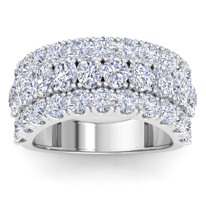 This lab grown diamond ring features 22 round shape lab grown diamonds and 12 oval shape lab grown diamonds totaling approximately 4 carats. Diamond color is G-H, diamond clarity is VS. This ring is in 14 karat white gold. This ring is 9mm wide.
