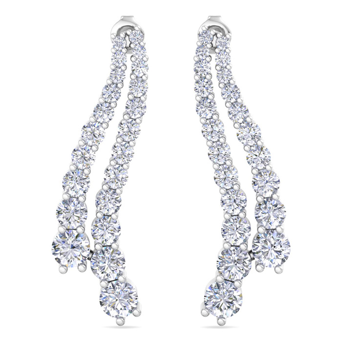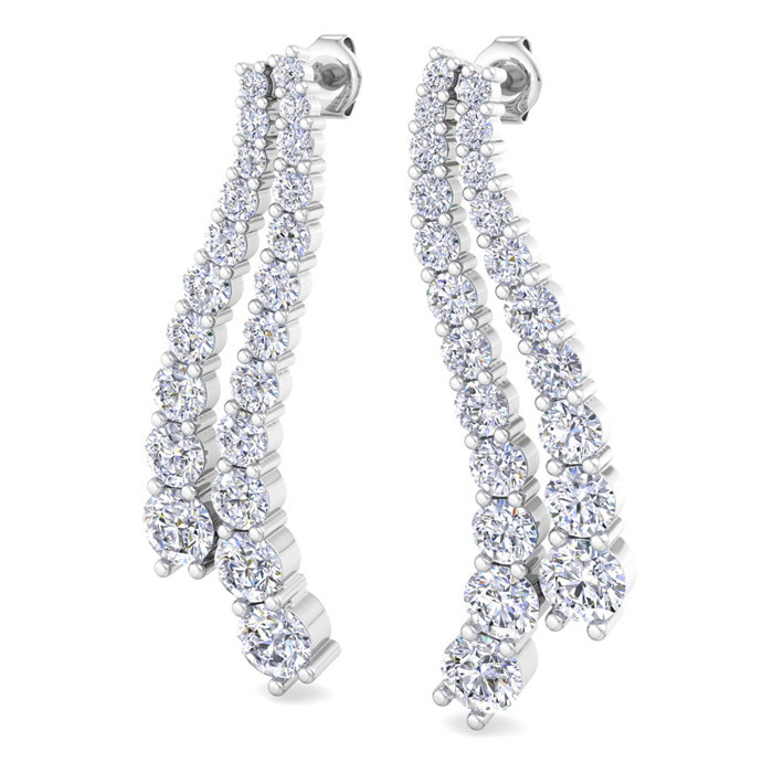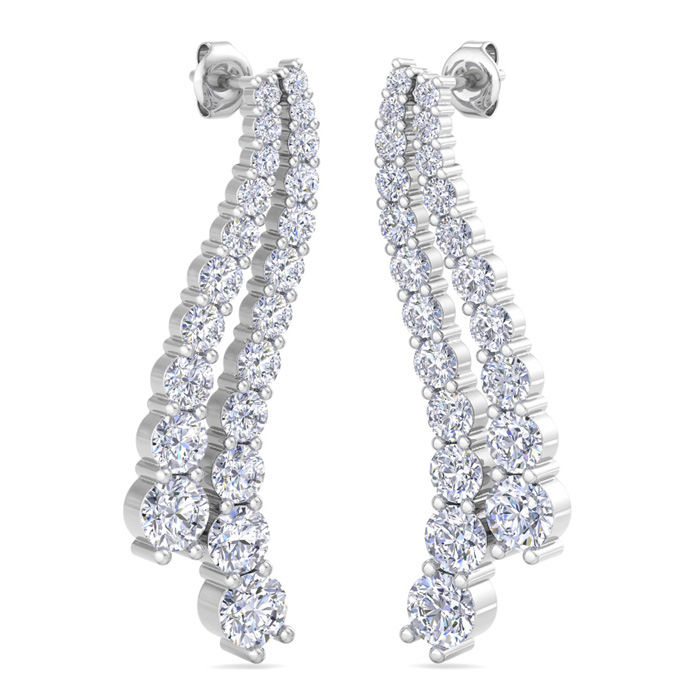 These lab grown diamond earrings feature 44 sparkling round shape lab grown diamonds totaling 4 carats. Diamond color is G-H, diamond clarity VS. These earrings are in 14 karat white gold and have comfortable and secure post with friction backs. The earrings drop down 1 1/2 Inches!