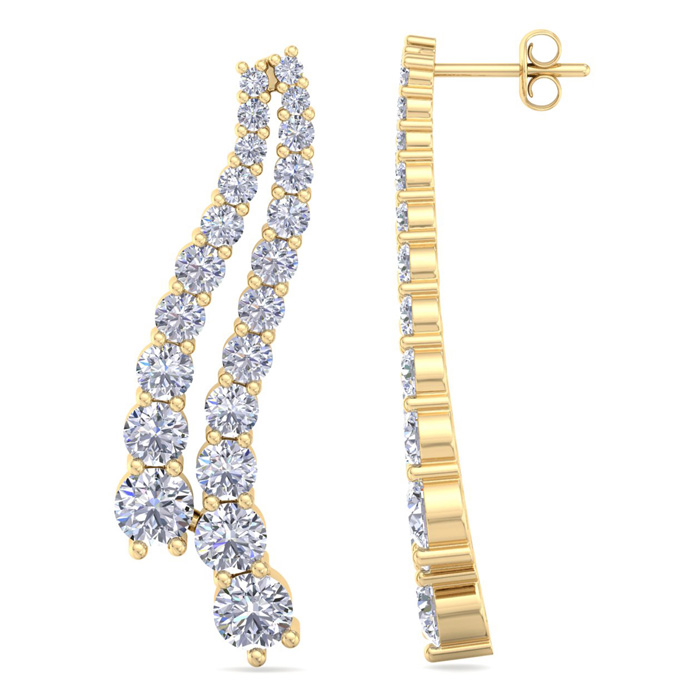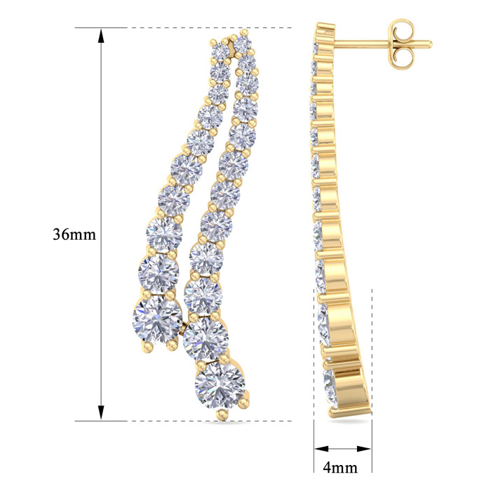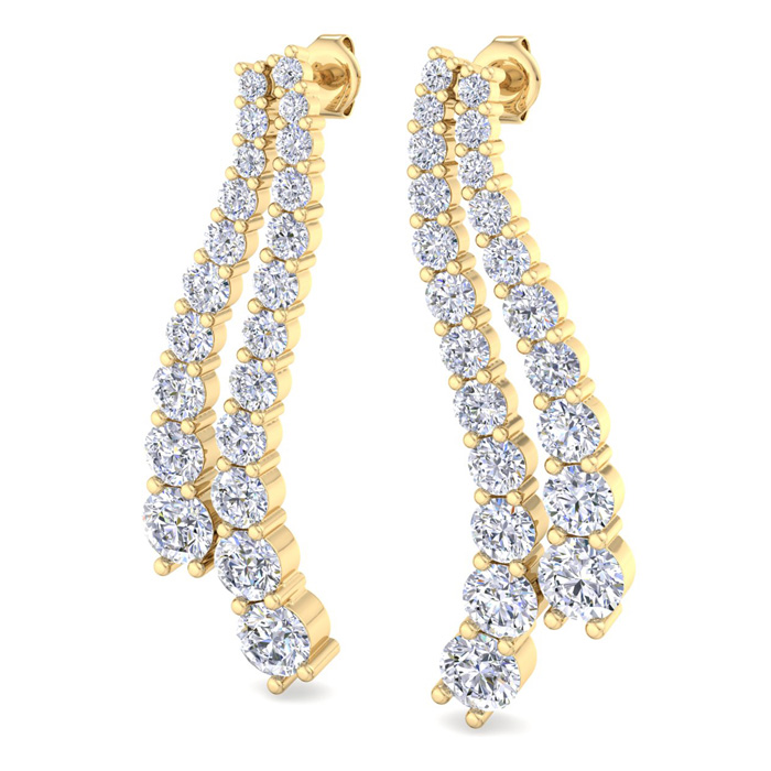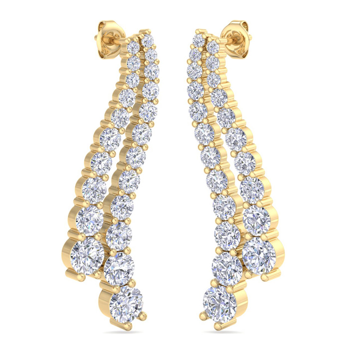 These lab grown diamond earrings feature 44 sparkling round shape lab grown diamonds totaling 4 carats. Diamond color is G-H, diamond clarity VS. These earrings are in 14 karat yellow gold and have comfortable and secure post with friction backs. The earrings drop down 1 1/2 Inches!
