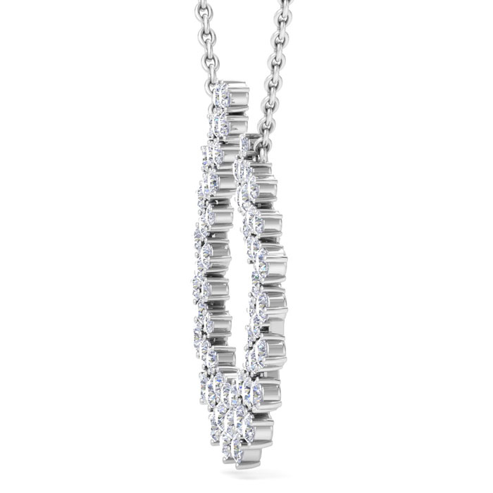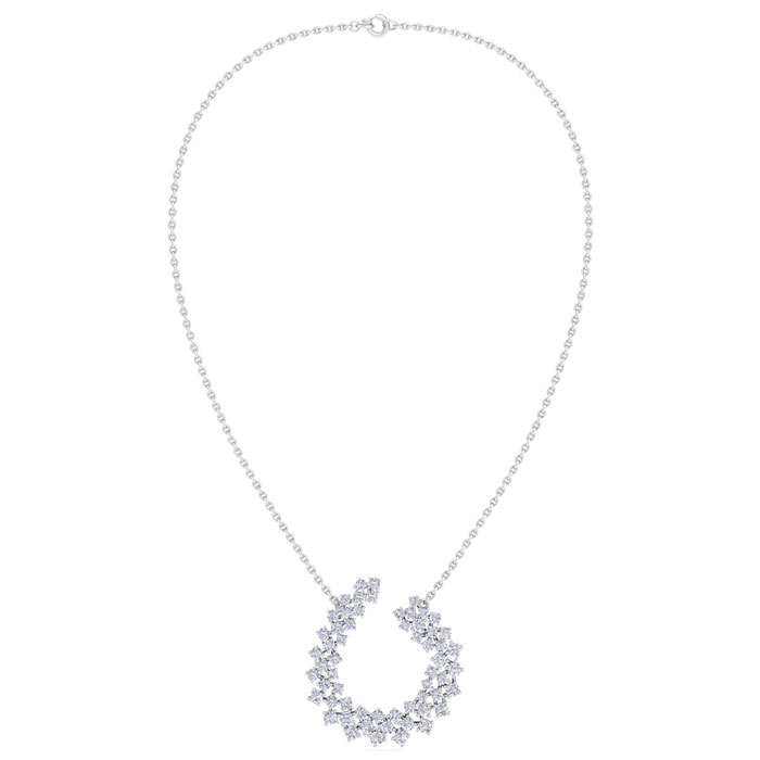 This lab grown diamond necklace features 59 round lab grown diamonds. Total carat weight is 4 carats and diamond color is G-H, diamond clarity is VS2. This necklace is in sterling silver and comes with an 18 inch cable chain with a spring-ring clasp. The pendant measures 1 1/2 inches.