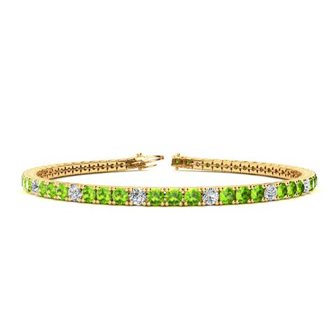 This classic gemstone bracelet features shimmering white diamonds in J-K color, I1-I2 clarity and peridot gemstones. The 6 inch bracelet contains 57 gemstones and diamonds at 2.71 carats. The 6.5 inch bracelet contains 62 gemstones and diamonds at 2.95 carats. The 7 inch bracelet contains 67 gemstones and diamonds at 3.19 carats. The 7.5 inch bracelet contains 72 gemstones and diamonds at 3.42 carats. The 8 inch bracelet contains 76 gemstones and diamonds at 3.61 carats. The 8.5 inch bracelet contains 81 gemstones and diamonds at 3.85 carats. The 9 inch bracelet contains 86 gemstones and diamonds at 4.09 carats. This bracelet is approximately 2.25mm wide and is crafted in 14 karat yellow gold. This bracelet has a secure, box with tongue and safety clasp.