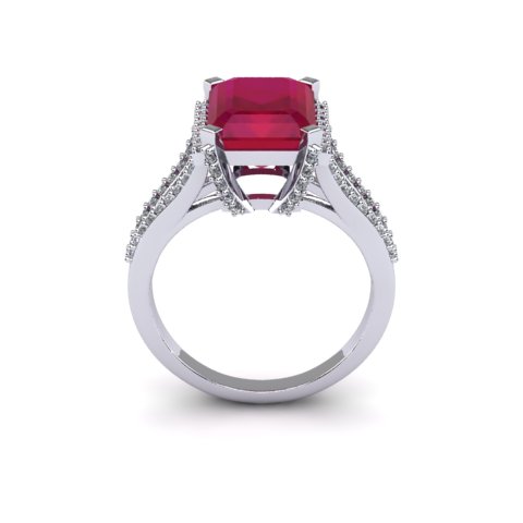 This stunning gemstone and diamond ring features one 10x8mm emerald cut ruby gemstone at 3 3/4 carats. It is surrounded by 72 sparkling diamonds in a halo and down the band in I-J color, I1-I2 clarity at 1/2 carat. Total gem weight is 4 carats. This ring is crafted in 14 karat white gold.