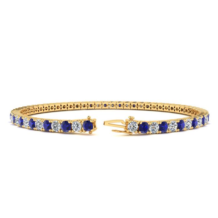 This classic gemstone bracelet features shimmering white diamonds in J-K color, I1-I2 clarity and sapphire gemstones. The 6 inch bracelet contains 57 gemstones and diamonds at 2.84 carats. The 6.5 inch bracelet contains 62 gemstones and diamonds at 3.10 carats. The 7 inch bracelet contains 67 gemstones and diamonds at 3.34 carats. The 7.5 inch bracelet contains 72 gemstones and diamonds at 3.60 carats. The 8 inch bracelet contains 76 gemstones and diamonds at 3.80 carats. The 8.5 inch bracelet contains 81 gemstones and diamonds at 4.04 carats. The 9 inch bracelet contains 86 gemstones and diamonds at 4.30 carats. This bracelet is approximately 2.25mm wide and is crafted in 14 karat yellow gold. This bracelet has a secure, box with tongue and safety clasp.