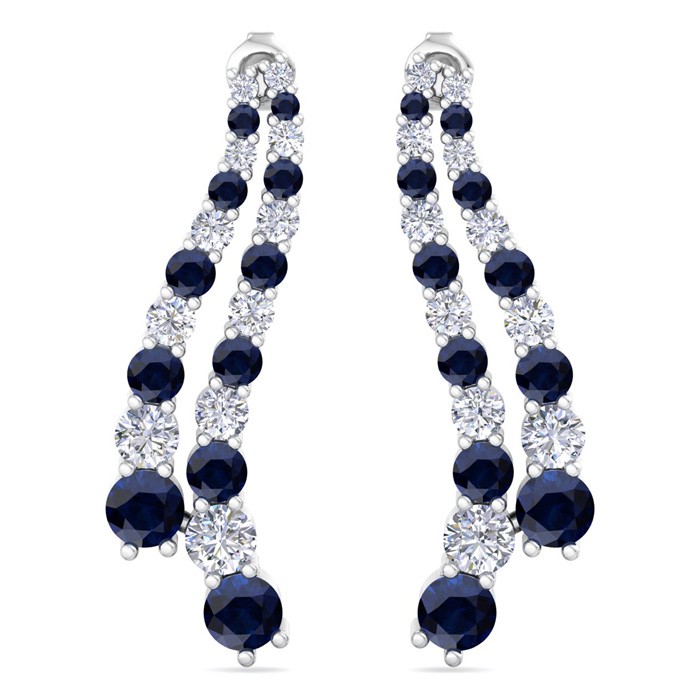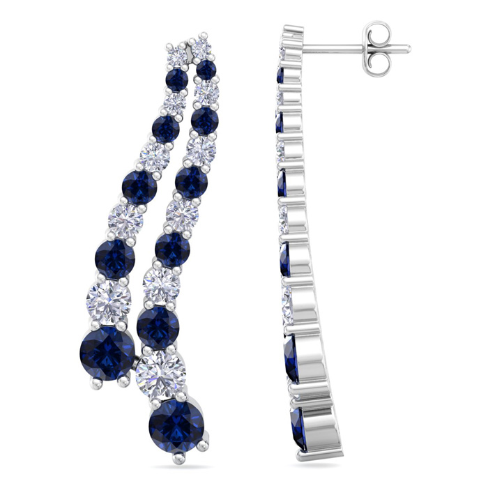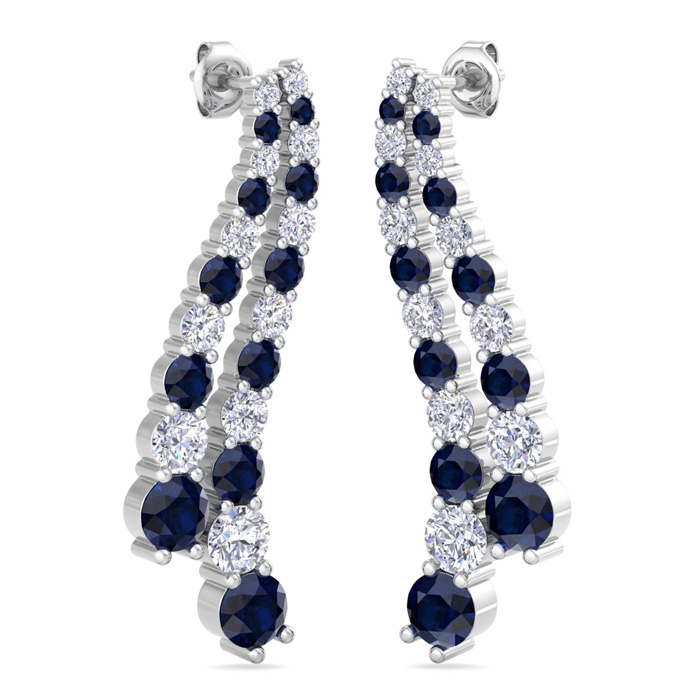 These lab grown diamond earrings feature 22 sparkling round shape lab grown diamonds and 22 sapphire gemstones totaling 4 carats. Diamond color is G-H, diamond clarity VS. These earrings are in 14 karat white gold and have comfortable and secure post with friction backs. The earrings drop down 1 1/2 Inches!