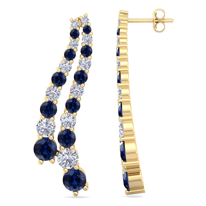 These lab grown diamond earrings feature 22 sparkling round shape lab grown diamonds and 22 sapphire gemstones totaling 4 carats. Diamond color is G-H, diamond clarity VS. These earrings are in 14 karat yellow gold and have comfortable and secure post with friction backs. The earrings drop down 1 1/2 Inches!