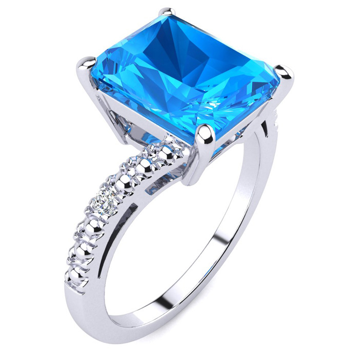 10 karat white gold emerald cut blue topaz and diamond ring with a total gem weight of 4 carats. Diamond content is .01ct in I/J color I2 clarity.