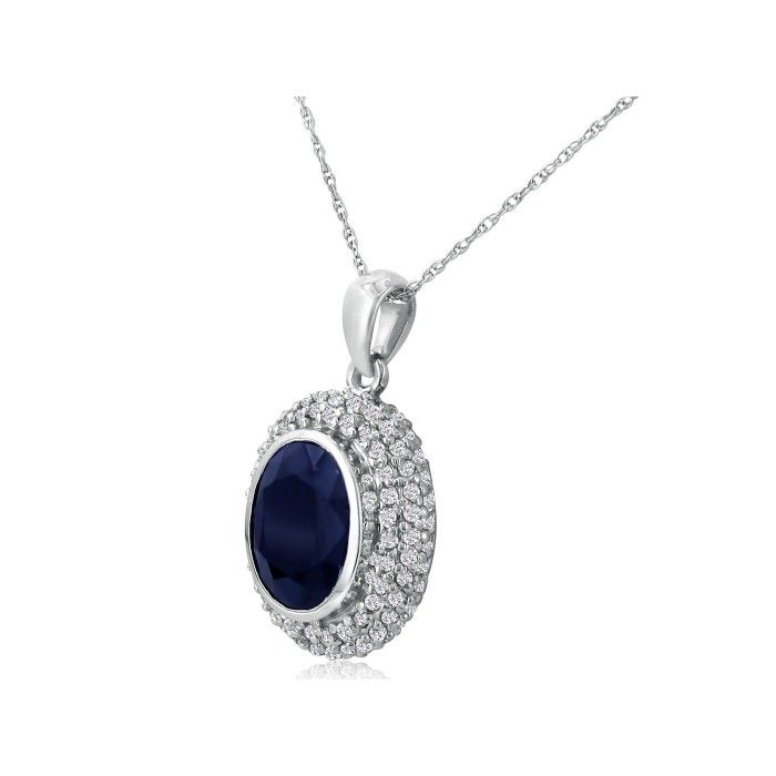 14k white gold, 4ct total gem weight sapphire and diamond pendant. Diamond content is 1/2ct in I/J color and I1 clarity.