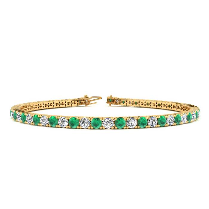 This classic gemstone bracelet features shimmering yellow diamonds in J-K color, I1-I2 clarity and emerald gemstones. The 6 inch bracelet contains 50 gemstones and diamonds at 3.77 carats. The 6.5 inch bracelet contains 55 gemstones and diamonds at 3.90 carats. The 7 inch bracelet contains 59 gemstones and diamonds at 4.22 carats. The 7.5 inch bracelet contains 63 gemstones and diamonds at 4.55 carats. The 8 inch bracelet contains 67 gemstones and diamonds at 4.81 carats. The 8.5 inch bracelet contains 72 gemstones and diamonds at 5.13 carats. The 9 inch bracelet contains 76 gemstones and diamonds at 5.46 carats. This bracelet is approximately 2.5mm wide and is crafted in 14 karat yellow gold. This bracelet has a secure, box with tongue and safety clasp.