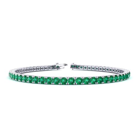 This classic gemstone bracelet features shimmering emerald gemstones. The 6 inch bracelet contains 50 gemstones at 4.05 carats. The 6.5 inch bracelet contains 55 gemstones at 4.20 carats. The 7 inch bracelet contains 59 gemstones at 4.55 carats. The 7.5 inch bracelet contains 63 gemstones at 4.90 carats. The 8 inch bracelet contains 67 gemstones at 5.16 carats. The 8.5 inch bracelet contains 72 gemstones at 5.53 carats. The 9 inch bracelet contains 76 gemstones at 5.88 carats. This bracelet is approximately 2.5mm wide and is crafted in 14 karat white gold. This bracelet has a secure, box with tongue and safety clasp.