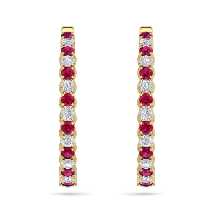 5 Carat Ruby and Diamond Hoop Earrings In 14 Karat Yellow Gold, 1 1/2 Inches