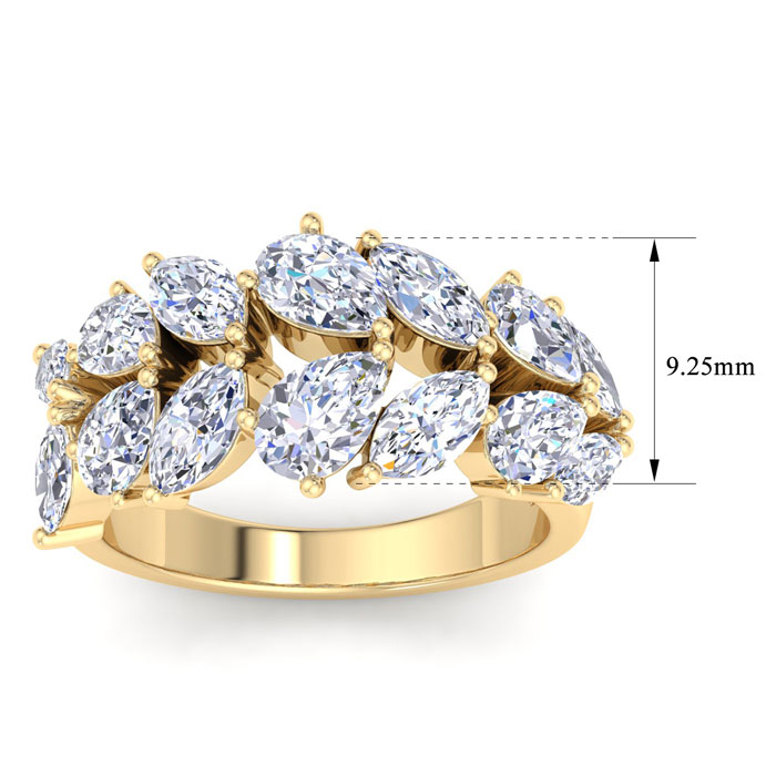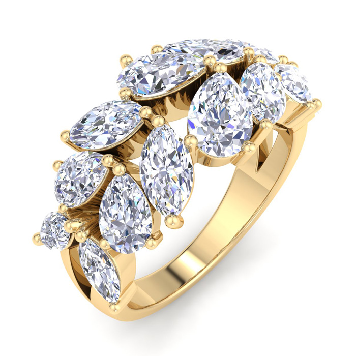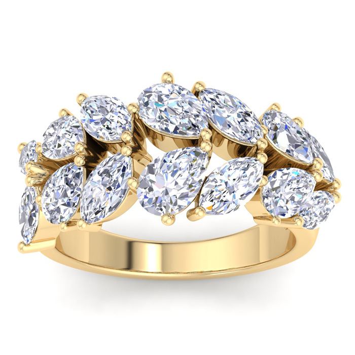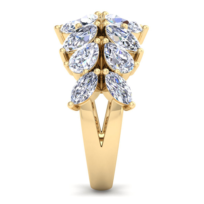 This lab grown diamond ring features 8 marquise shape lab grown diamonds and 6 pear shape lab grown diamonds totaling approximately 5 3/4 carats. Diamond color is G-H, diamond clarity is VS. This ring is in 14 karat yellow gold. This ring is 15mm wide.