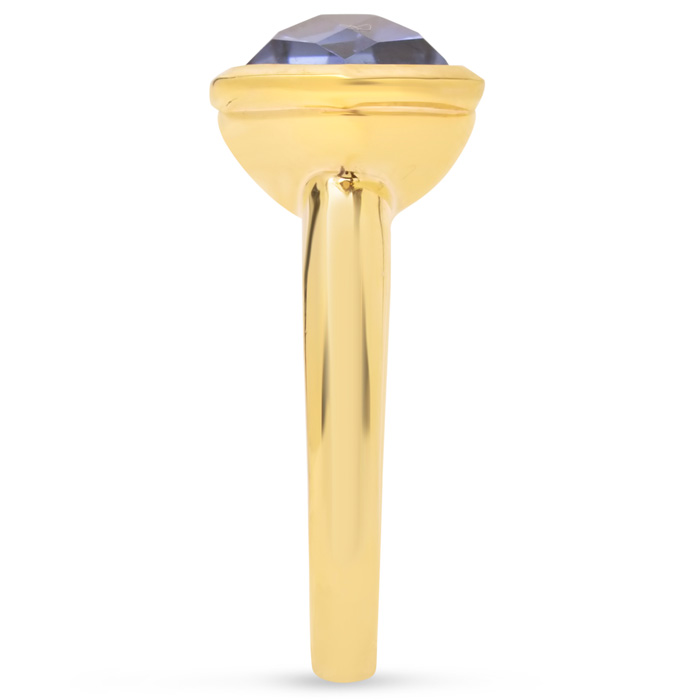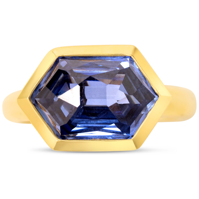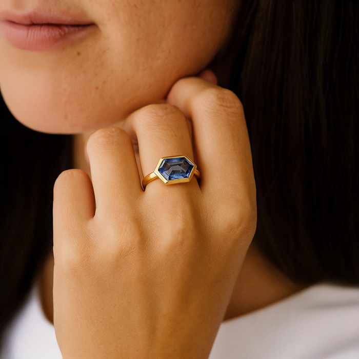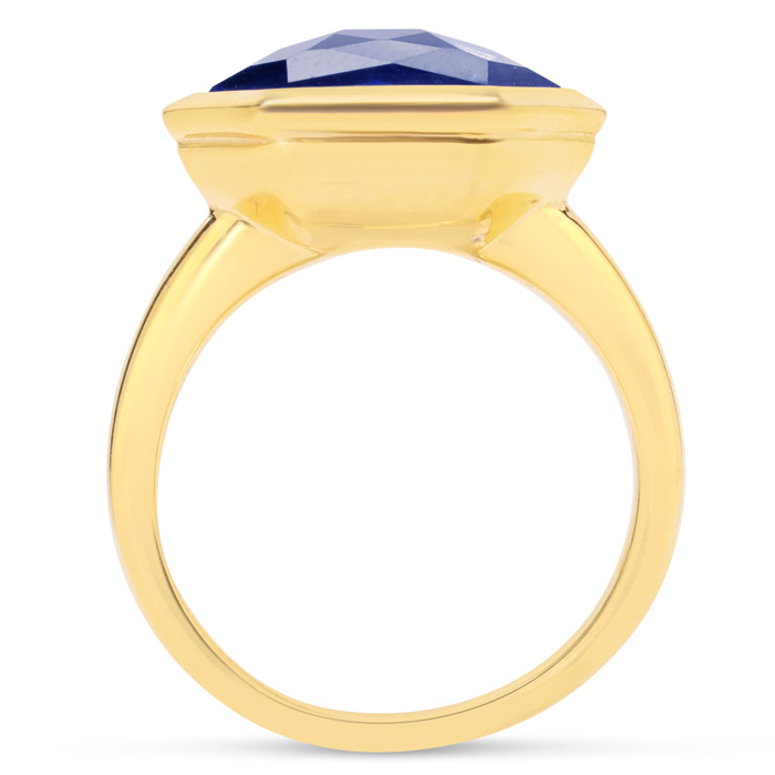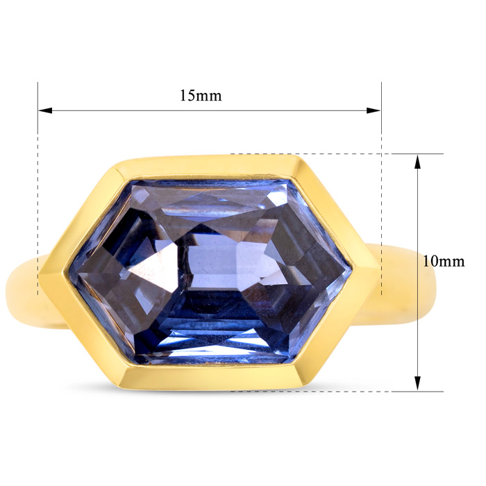This gemstone ring features one 14x9mm created blue spinel gemstone in a hexagon shape weighing approximately 5.60 carats. This ring is set in a 14k yellow gold over sterling silver bezel setting.