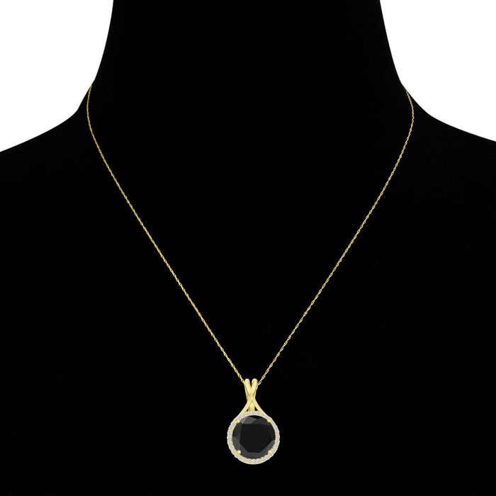 This necklace features a GIGANTIC black diamond weighing approximately 4.75 carats in I3 clarity. It measures 11x11mm. This black diamond is surrounded by 32 sparkling diamonds in G-H color, I1-I2 clarity at 0.24 carats total. Total gem weight is approximately 5 carats. This necklace is in 14 karat yellow gold and comes with a cable chain with spring-ring clasp. The pendant measures 14x14mm, just over 1/2 inch.