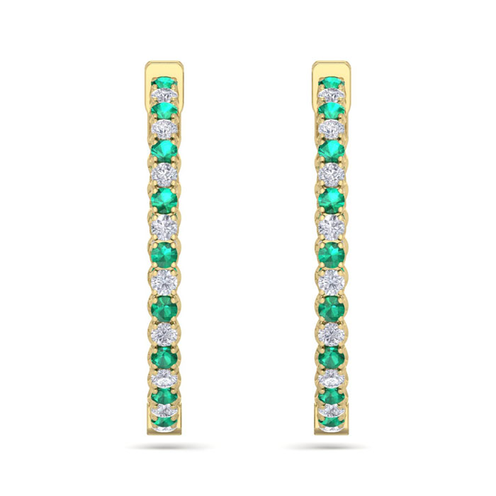 5 Carat Emerald and Diamond Hoop Earrings In 14 Karat Yellow Gold, 1 1/4 Inch