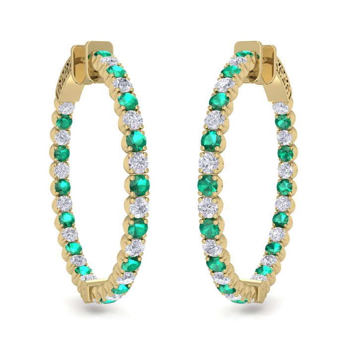 These classic hoop earrings feature 31 sparkling diamonds in J-K color, I2-I3 clarity and 31 emerald gemstones. Total carat weight is 5 carats. These earrings are in 14 karat yellow gold and have secure hidden snap backs. These earrings are 1 1/4 inch in diameter.