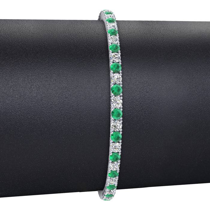 This classic gemstone bracelet features shimmering white diamonds in J-K color, I1-I2 clarity and emerald gemstones. The 6 inch bracelet contains 50 gemstones and diamonds at 3.77 carats. The 6.5 inch bracelet contains 55 gemstones and diamonds at 3.90 carats. The 7 inch bracelet contains 59 gemstones and diamonds at 4.22 carats. The 7.5 inch bracelet contains 63 gemstones and diamonds at 4.55 carats. The 8 inch bracelet contains 67 gemstones and diamonds at 4.81 carats. The 8.5 inch bracelet contains 72 gemstones and diamonds at 5.13 carats. The 9 inch bracelet contains 76 gemstones and diamonds at 5.46 carats. This bracelet is approximately 2.5mm wide and is crafted in 14 karat white gold. This bracelet has a secure, box with tongue and safety clasp.