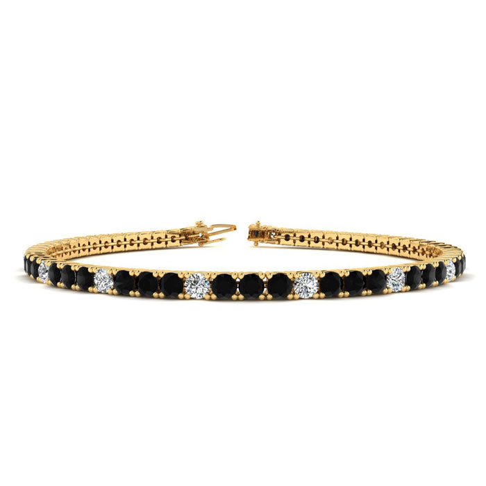 This classic mens diamond bracelet features shimmering white diamonds in J-K color, I1-I2 clarity and black diamonds in I3 clarity. The 6 inch bracelet contains 58 black and white diamonds at 3.48 carats. The 6.5 inch bracelet contains 55 black and white diamonds at 3.60 carats. The 7 inch bracelet contains 59 black and white diamonds at 3.90 carats. The 7.5 inch bracelet contains 63 black and white diamonds at 4.20 carats. The 8 inch bracelet contains 67 black and white diamonds at 4.44 carats. The 8.5 inch bracelet contains 72 black and white diamonds at 4.74 carats. The 9 inch bracelet contains 76 black and white diamonds at 5.04 carats. This bracelet is approximately 2.5mm wide and is crafted in 14 karat yellow gold. This bracelet has a secure, box with tongue and safety clasp.