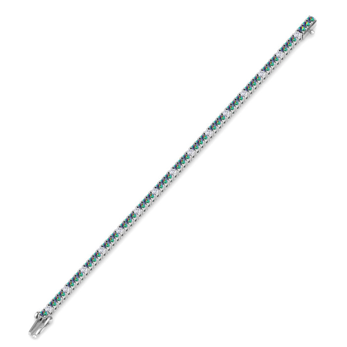 This classic gemstone bracelet features shimmering white diamonds in J-K color, I1-I2 clarity and mystic topaz gemstones. The 6 inch bracelet contains 50 gemstones and diamonds at 4.36 carats. The 6.5 inch bracelet contains 55 gemstones and diamonds at 4.50 carats. The 7 inch bracelet contains 59 gemstones and diamonds at 4.88 carats. The 7.5 inch bracelet contains 63 gemstones and diamonds at 5.26 carats. The 8 inch bracelet contains 67 gemstones and diamonds at 5.56 carats. The 8.5 inch bracelet contains 72 gemstones and diamonds at 5.94 carats. The 9 inch bracelet contains 76 gemstones and diamonds at 6.30 carats. This bracelet is approximately 2.5mm wide and is crafted in 14 karat white gold. This bracelet has a secure, box with tongue and safety clasp.