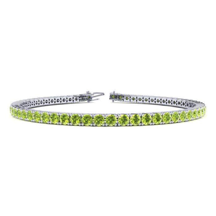 This classic gemstone bracelet features shimmering peridot gemstones. The 6 inch bracelet contains 50 gemstones at 3.48 carats. The 6.5 inch bracelet contains 55 gemstones at 3.60 carats. The 7 inch bracelet contains 59 gemstones at 3.90 carats. The 7.5 inch bracelet contains 63 gemstones at 4.20 carats. The 8 inch bracelet contains 67 gemstones at 4.44 carats. The 8.5 inch bracelet contains 72 gemstones at 4.74 carats. The 9 inch bracelet contains 76 gemstones at 5.04 carats. This bracelet is approximately 2.5mm wide and is crafted in 14 karat white gold. This bracelet has a secure, box with tongue and safety clasp.