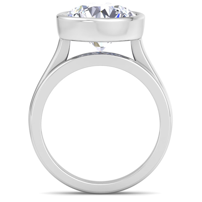 This lab grown diamond ring features a 5 Carat Round shape center lab grown diamond in G-H color, VS clarity in a sideways bezel setting. This ring is in 14 karat white gold. This ring includes a matching gold band.