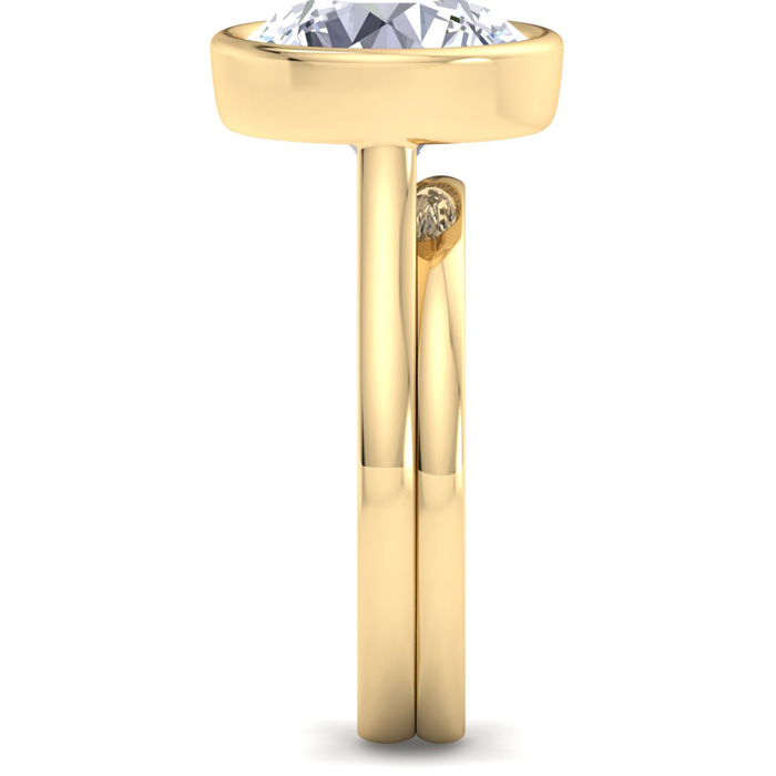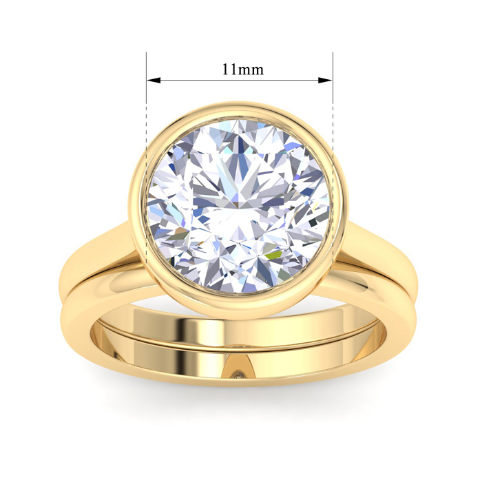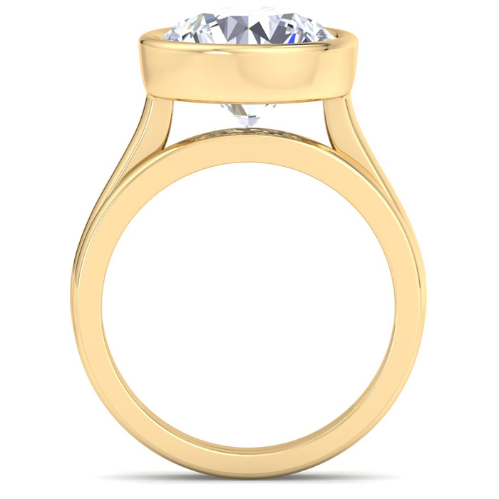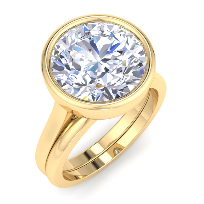This lab grown diamond ring features a 5 Carat Round shape center lab grown diamond in G-H color, VS clarity in a sideways bezel setting. This ring is in 14 karat yellow gold. This ring includes a matching gold band.