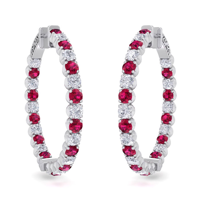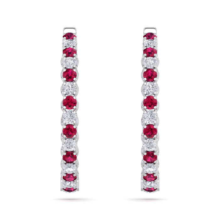 5 Carat Ruby and Diamond Hoop Earrings In 14 Karat White Gold, 1 1/2 Inches