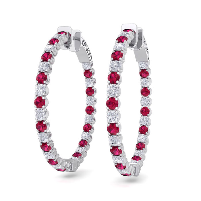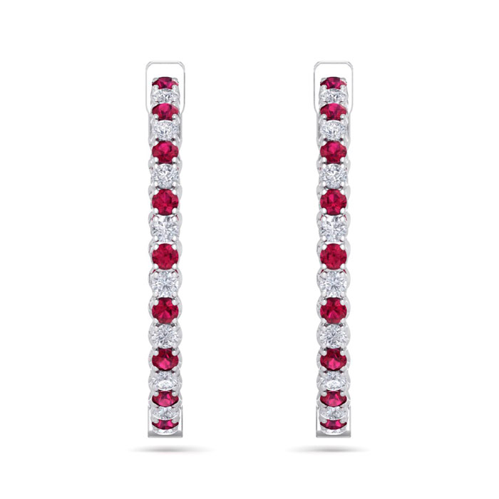 5 Carat Ruby and Diamond Hoop Earrings In 14 Karat White Gold, 1 1/4 Inch