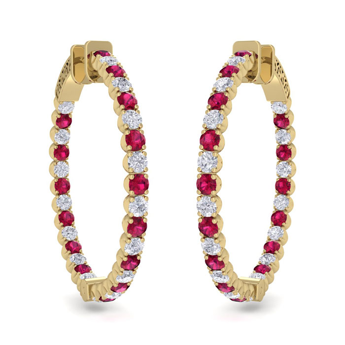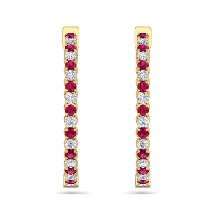 5 Carat Ruby and Diamond Hoop Earrings In 14 Karat Yellow Gold, 1 1/4 Inch