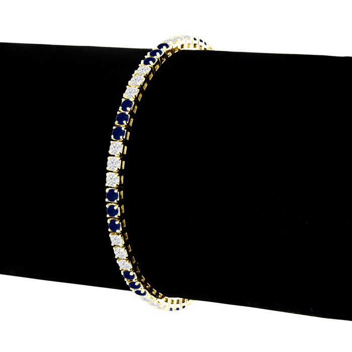Who says you can't combine ruby jewelry and diamond tennis bracelets? This very fine 5 carat total gem weight sapphire and diamond line style tennis bracelet is mounted in 14 karat yellow gold. Featuring 29 fine H/I color SI2 clarity diamonds and 30 top quality excellent sapphires. It's not just fine gemstone jewelry, it's an heirloom.