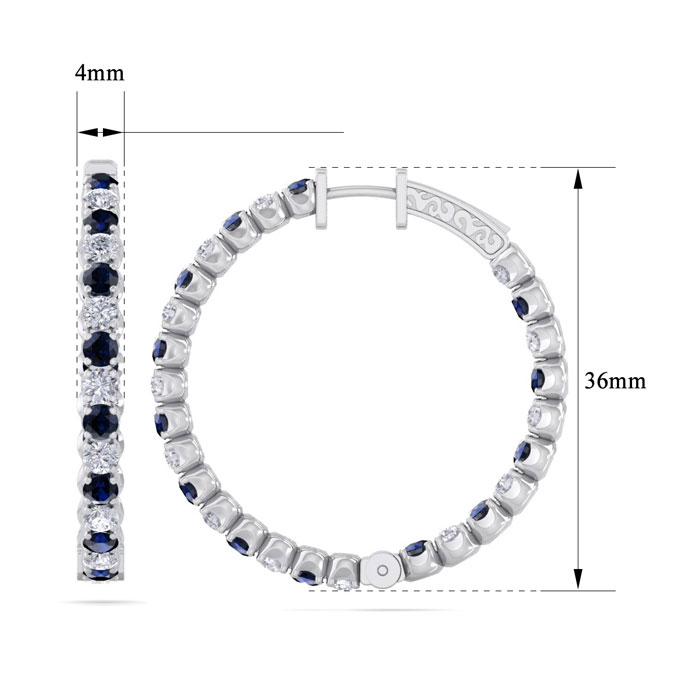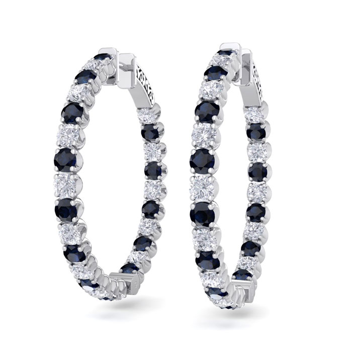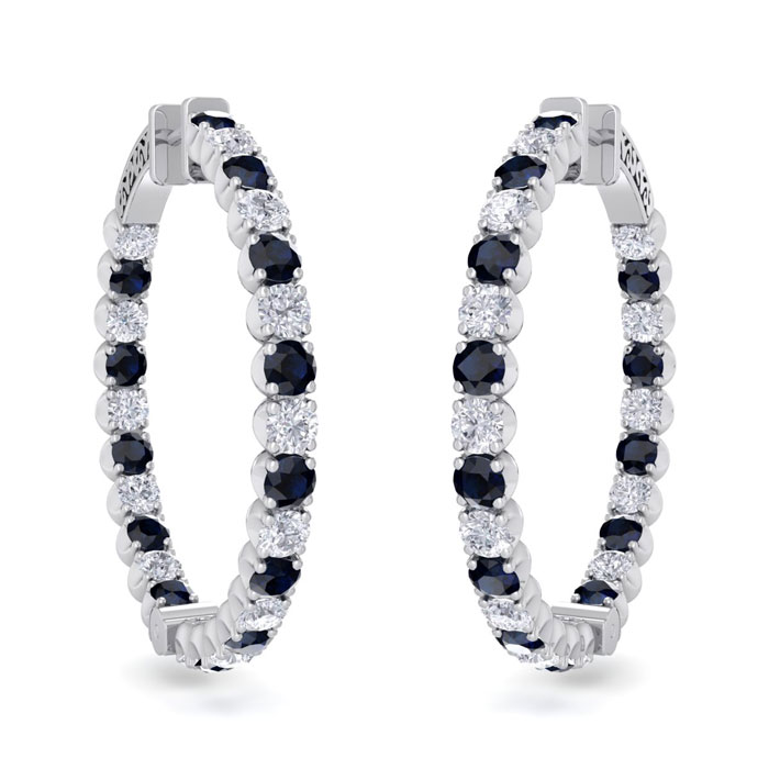 These classic hoop earrings feature 26 sparkling diamonds in J-K color, I2-I3 clarity and 26 sapphire gemstones. Total carat weight is 5 1/4 carats. These earrings are in 14 karat white gold and have secure hidden snap backs. These earrings are 1 1/2 inches in diameter.