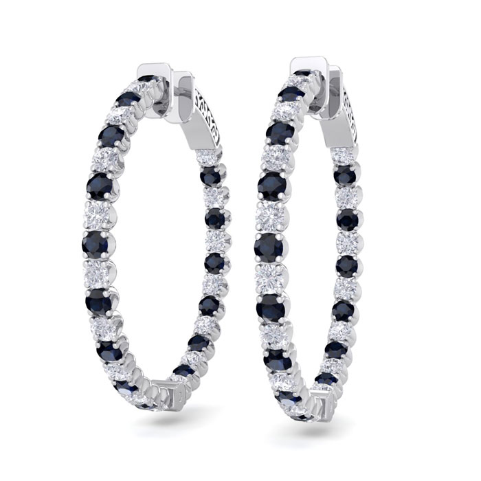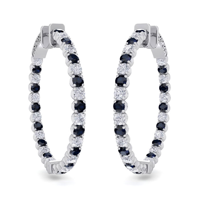 These classic hoop earrings feature 31 sparkling diamonds in J-K color, I2-I3 clarity and 31 sapphire gemstones. Total carat weight is 5 carats. These earrings are in 14 karat white gold and have secure hidden snap backs. These earrings are 1 1/4 inch in diameter.