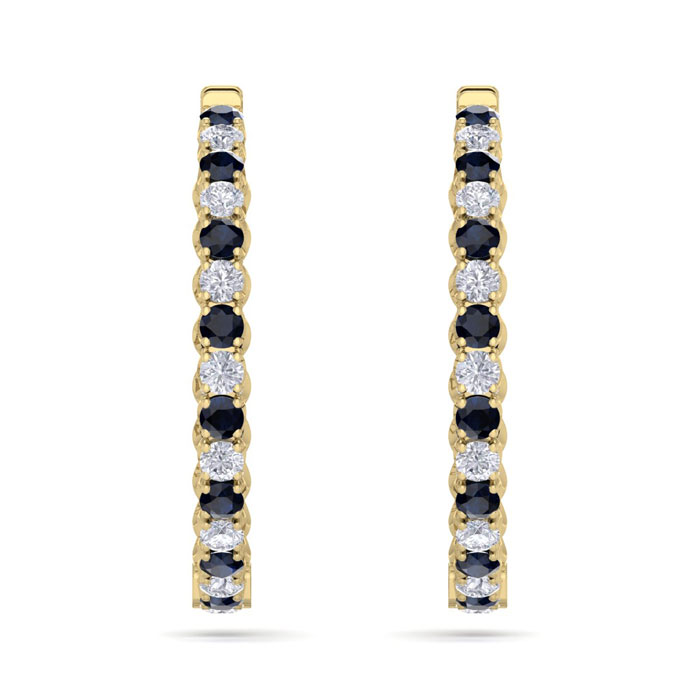 These classic hoop earrings feature 26 sparkling diamonds in J-K color, I2-I3 clarity and 26 sapphire gemstones. Total carat weight is 5 1/4 carats. These earrings are in 14 karat yellow gold and have secure hidden snap backs. These earrings are 1 1/2 inches in diameter.