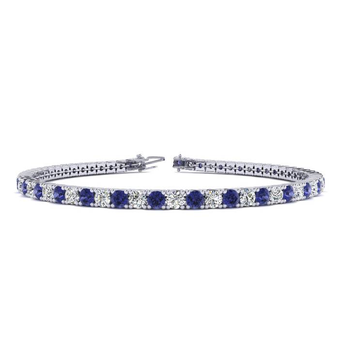 This classic gemstone bracelet features shimmering white diamonds in J-K color, I1-I2 clarity and tanzanite gemstones. The 6 inch bracelet contains 50 gemstones and diamonds at 4.06 carats. The 6.5 inch bracelet contains 55 gemstones and diamonds at 4.20 carats. The 7 inch bracelet contains 59 gemstones and diamonds at 4.54 carats. The 7.5 inch bracelet contains 63 gemstones and diamonds at 4.90 carats. The 8 inch bracelet contains 67 gemstones and diamonds at 5.18 carats. The 8.5 inch bracelet contains 72 gemstones and diamonds at 5.52 carats. The 9 inch bracelet contains 76 gemstones and diamonds at 5.88 carats. This bracelet is approximately 2.5mm wide and is crafted in 14 karat white gold. This bracelet has a secure, box with tongue and safety clasp.
