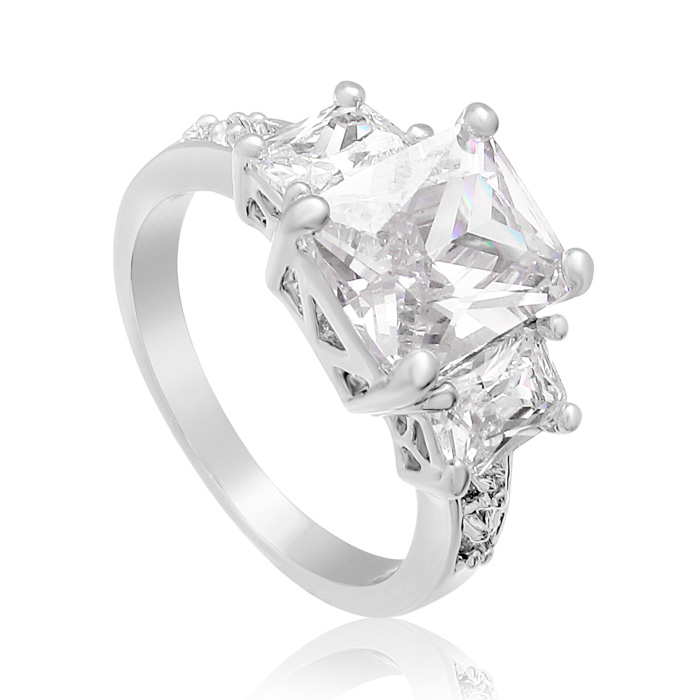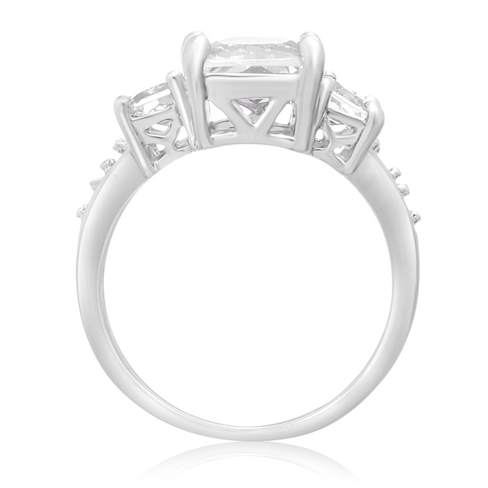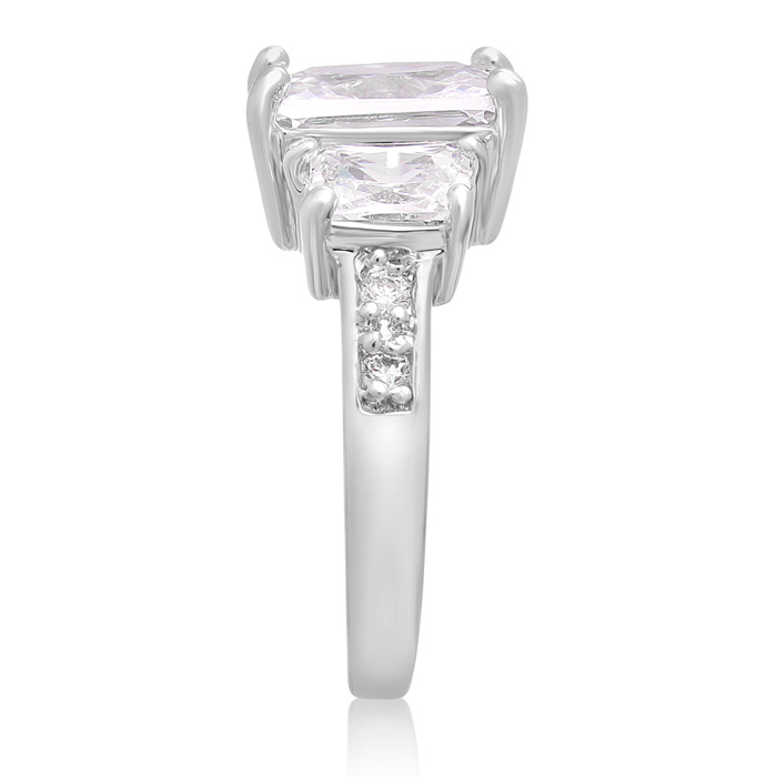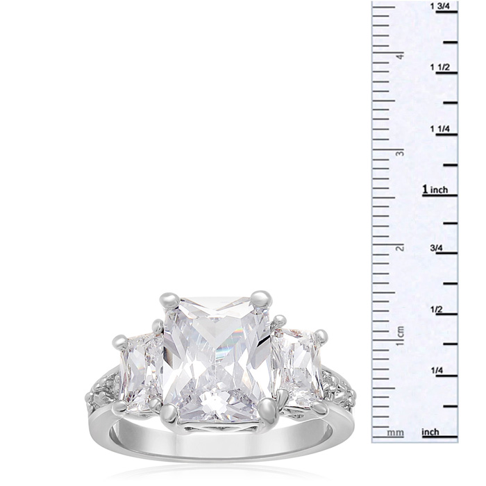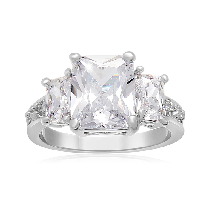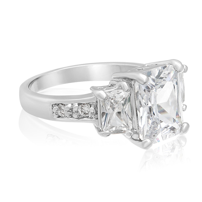 This simulated diamond engagment ring features an emerald shape center surrounded by baguettes. This ring has the look of a 5 carat total weight ring. This ring is crafted in silver plated eco brass.