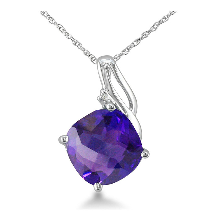 10k white gold cushion cut amethyst and diamond pendant with a total gem weight of 5cts. Diamond content is I/J color and I2 clarity. It even comes with a complementary 18-inch chain.