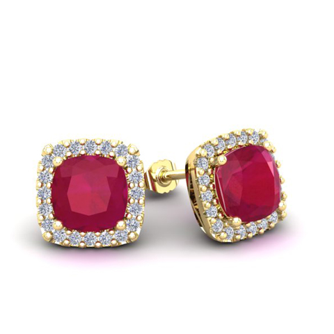 These stunning gemstone and halo diamond earrings feature two 8x8mm cushion cut ruby gemstones at 6.20 carats. The gemstones are surrounded by 40 sparkling diamonds in a halo in I-J color, SI2-I1 clarity at 0.50 carats. Total gem weight is 6.70 carats. These earrings are crafted in 14 karat yellow gold and come with comfortable and secure post with friction backs.